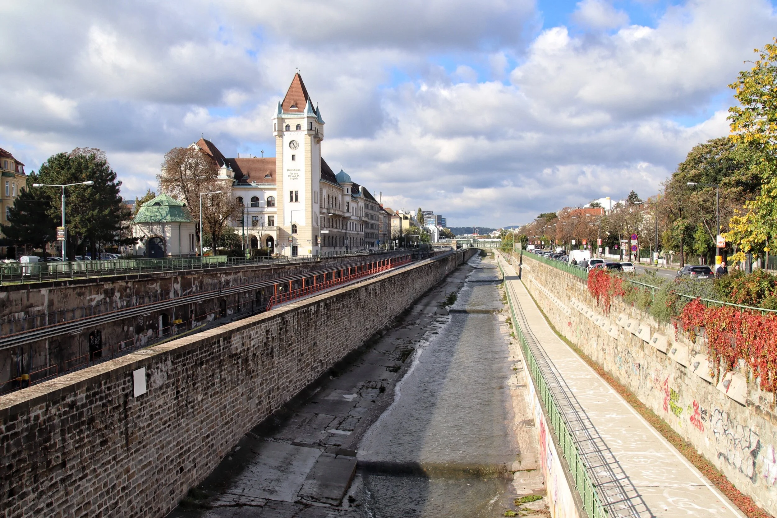 Heute gibt es ein Foto des Amtshauses Hietzing das im Stil der Neogotik und dee Neorenaissance erbaut wurde. Davor die Trasse der U4 und des Wienflusses.